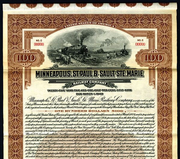 Minnesota, 1924, $100 25 Year 5 1/2% Specimen Bond, Black printing with brown border and underprint, Moving locomotive with famers watching on, POC's and red SPECIMEN overprints, ABNC. Listed railroad but unlisted bond denomination in Cox.