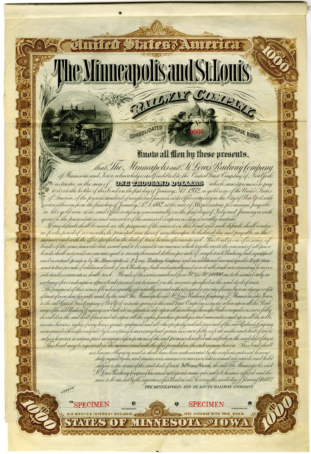 MN & IA, 1882. $1000 Specimen 6% Consolidated Mortgage Coupon Bond, Black text with brown border, Train stopped at rural station at top left corner. Red specimen overprints, 0000 serial numbers, and POCs. VF condition, ABNC. Only bond listed in Cox, Rare.