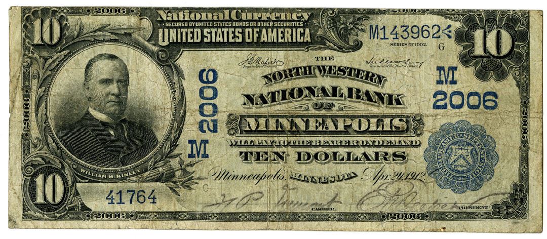 Minneapolis, MN. $10, 1902 DB, Ch#M 2006, S/N 41764-M143962, Fine to Choice Fine with 3 large margins and one close on top.