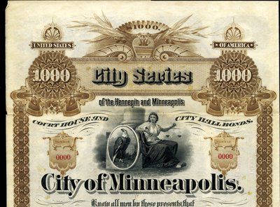 1890. $1,000. Specimen Bond. Brown border. "City Series of the Hennepin and Minneapolis Court House and City Hall Bonds". Seated allegorical woman with scales with eagle in oval on top and Minnesota Arms on bottom. Coupons attached. Red specimen overprints, POC's and "00000" serial numbers. VF condition. Rare state bond. ABNC