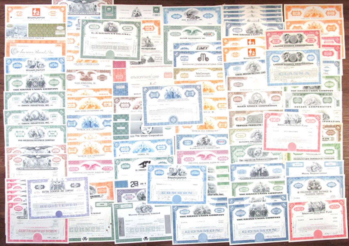 Various States and Countries. Lot of 90+, I/C & I/U Assortment of Stock and Bonds, Highlights Include: Upland Corp., Flavos International, Inc., West Indies Enterprises, Inc., Environment Onc Corp., Union Corp., 2B System, Inc., Monfort of Colorado, Inc., Howard Johnson Co., American Tobacco Co., Phillips-Van Heusen Corp., Grand Union Co., Philippine Long Distance Telephone Co., Massey-Ferguson Ltd., Pan American World Airways, Inc. and more. Certificates range from Fine to AU condition or better. Sold "AS IS" no returns accepted. (90+)