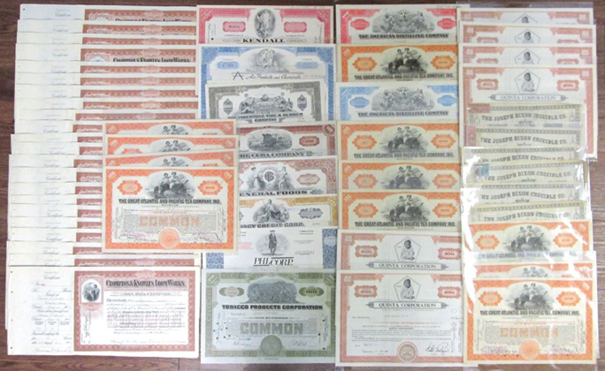 Lot of 60+ Issued Stocks and Bonds, Highlights Include: Kendall, Air Products and Chemicals Inc., Firestone Tire & Rubber Co., Cuba Co., General Foods Corp., Macy Credit Corp., PhlCorp, Inc., American Distilling Co., Great Atlantic and Pacific Tea Co. Inc., Quinta Corp., Crompton & Knowles Loom Works, and more. Certificates range from Fine to XF condition. (63). Sold "AS IS" no returns accepted.
