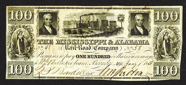 Brandon, Mississippi, $100, Issued and Uncancelled, Locomotive in middle with allegorical justices on left and right with man's portrait flanking train, S/N 58, VF to XF with internal pre-printing paper fold on left. DTLC.