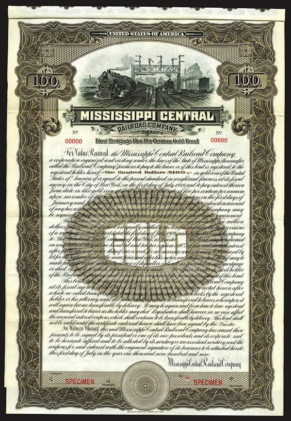 MS. Specimen $100 1st Mortgage 5% Gold Coupon Bond. Brown border and undertint. 2 locomotives with track workers in train yard. VF condition. Rare and attractive bond. ABNC. This is the only bond of this type listed for this railroad and is a Specimen only issue. This is the same bond that we last offered in our June 2008 Auction and is the one that is the pictured bond in Cox. Rare and very attractive bond. ABNC.