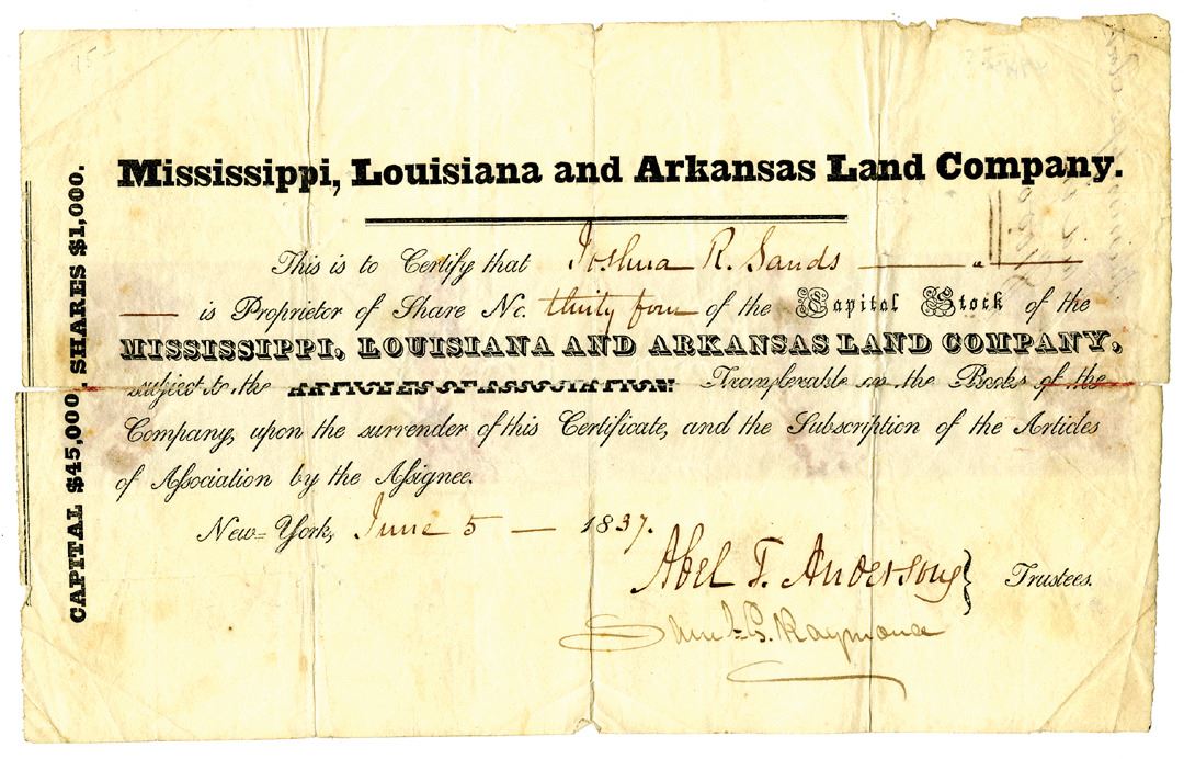 Louisiana. Mississippi. Arkansas. (Issued in New York), 1837. One Share I/U Capital Stock Certificate, S/N 34, Black text. VG to Fine condition with pronounced fold lines and splitting that has been repaired on back, with some glue staining from repair. Issued to Joshua R. Sands, likely Joshua Ratoon Sands (May 13, 1795 - October 2, 1883), who was an officer in the United States Navy who rose to the rank of Rear Admiral. He served in the War of 1812, the Mexican-American War, and the Civil War. Rare and early southern land company established during the 1837 financial panic and depression. The company had a capitalization of $45,000 at $1000 per share. Could use a little loving care but still rare and desirable.