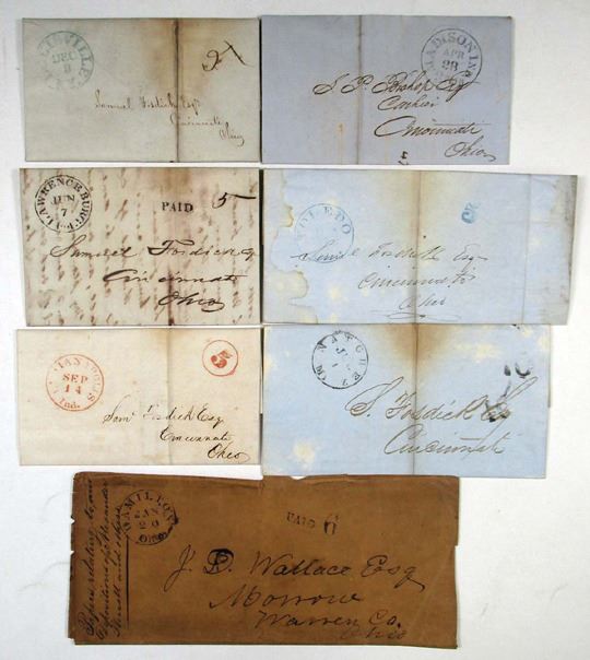 Mississippi, Ohio, Indiana and Kentucky, Lot of 7 covers, all with Postal Handstamps, ca.1840-50s, Incudes: 1847, Natchez., Mississippi, "10" handstamp in black; 3 Indiana stampless letter, one with a red postmark and "5" in circle, black postmark and "PAID" with manuscript "5"; 2 Ohio stampless covers, including Toledo in blue with Printed blue "5" and Hamilton, OH with "Paid 6" printed; and blue Louisville, KY, stampless cover with blue postmark. Postal handstamps include Indianapolis, IN; Natchez; Toledo, OH; Madison, IN; Lawrenceburg; Louisville, KY; and Hamilton, OH. All are in VG to Very Fine condition with some signs of wear. (7)