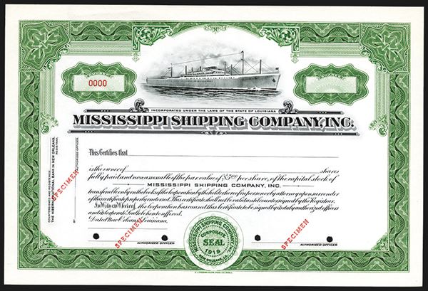 Louisiana, 19xx (ca.1940's), Odd Shares, Specimen Stock, black on green border and underprint, Large moving ship top center, VF-XF condition, E.A. Wright BNC.
