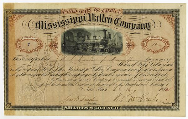 Mississippi. 10 Shares Capital Stock Issued and Cancelled Certificate, Black print on brown border and under tint, Locomotive at top exiting tunnel, Low serial number -#7, Hand written cancelled at left side, NBNC.