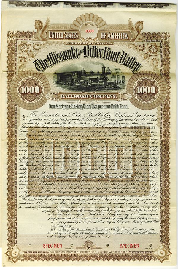 Montana Territory, 1887. $1000 Specimen 5% First Mortgage Sinking Fund Gold Coupon Bond, Black text with brown border and undertint, Profile of a train passing a station depicted at top center. Red specimen overprints, 0000 serial numbers, POCs. VF condition with archivally reinforced splitting along fold lines, ABNC. 2 examples found in the ABN Archives in 2002, this is the only example available. Rare and historic territorial railroad certificate.