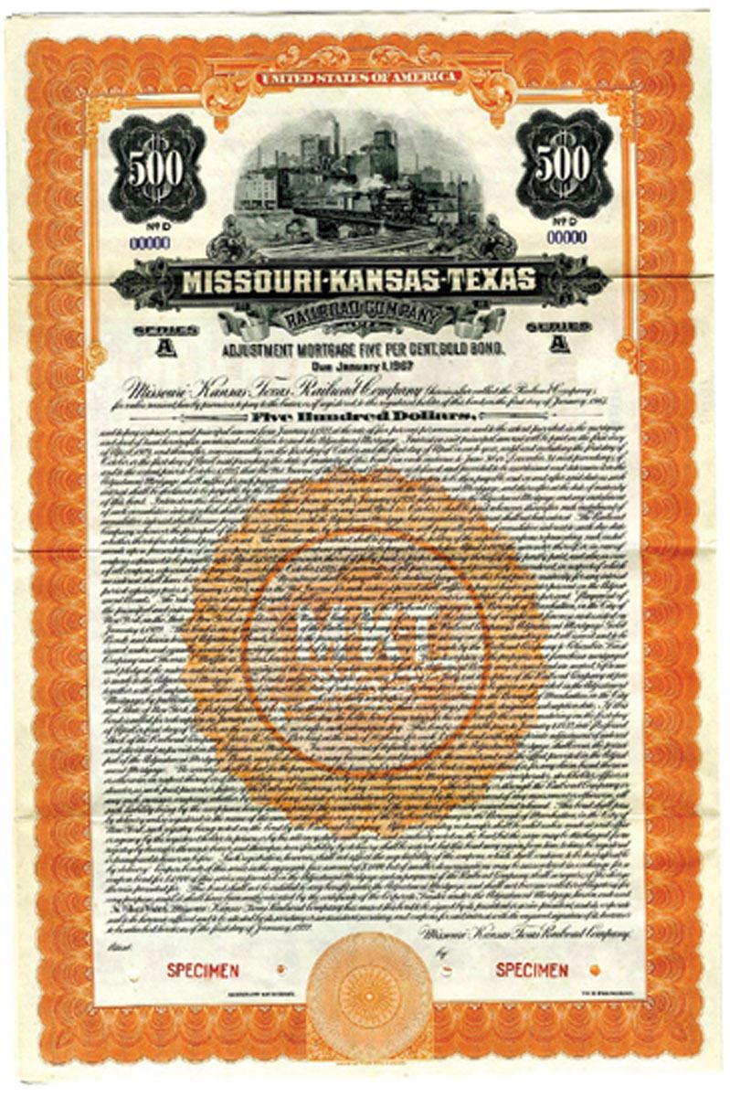 Missouri-Kansas-Texas Railroad Co., 1922 $500 Specimen 5% Gold Coupon Bond, Fine. Missouri, Kansas & Texas. $500 Specimen 5% Series A Adjustment Mortgage Gold Coupon Bond, Black print on orange border and under tint, Locomotive at top crossing bridge leaving factory, Specimen overprints and POC's, Fine condition with minor toning, ABNC.