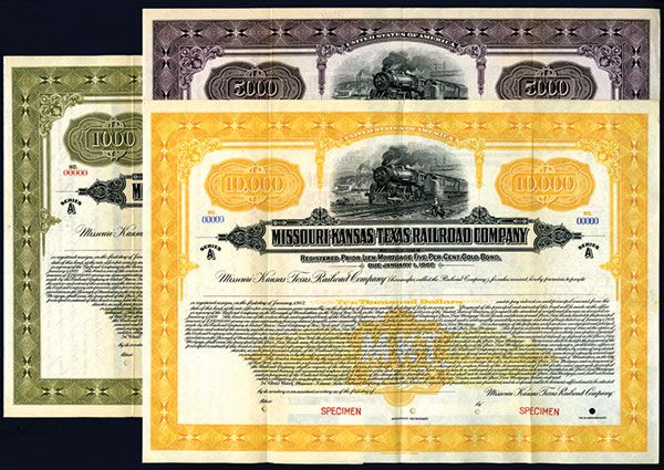 Lot of 3 Specimen Bonds. 1)-3) 1922. $1000-$5000-$10000 5% Gold Specimen Bonds in Olive, Purple and Yellow. Moving locomotive r-l under signal tower with railway workers top center. POC's and red SPECIMEN overprints. VF-XF condition. ABNC. Listed railroad but unlisted bonds in Cox.