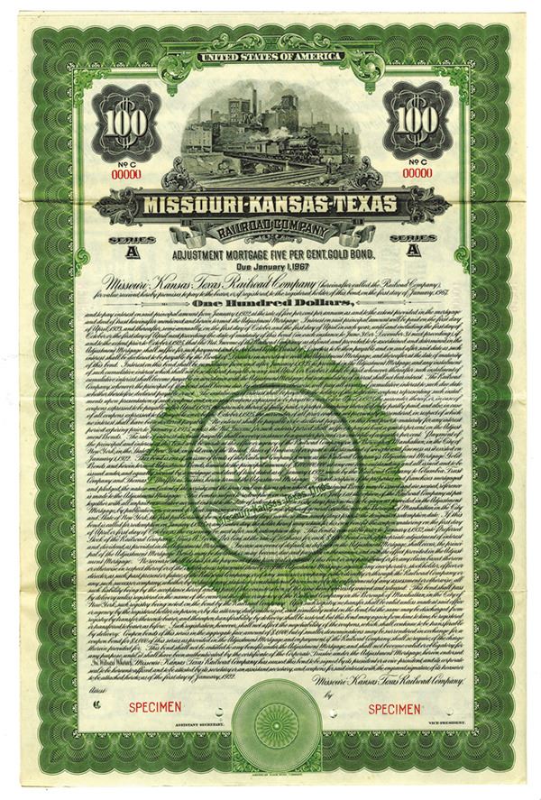 Missouri, Kansas & Texas. $100 Specimen 5% Series A, Adjustment Mortgage Gold Coupon Bond, Black print on green border and under tint, Locomotive crossing bridge at top, Specimen overprints and POC's, VF-XF condition, ABNC.