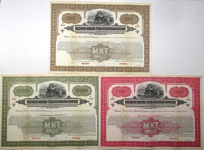 Missouri, 1922. Lot of 3, Missouri-Kansas-Texas Railroad Co., Registered Specimen 4 1/2% Bonds in varying colors and denominations: $1000 in brown, $5000 in red, and $10,000 in green. All have Specimen Overprints, 00000 serial numbers, and POCs. ABNC. (3). Sold "AS IS" no returns accepted.