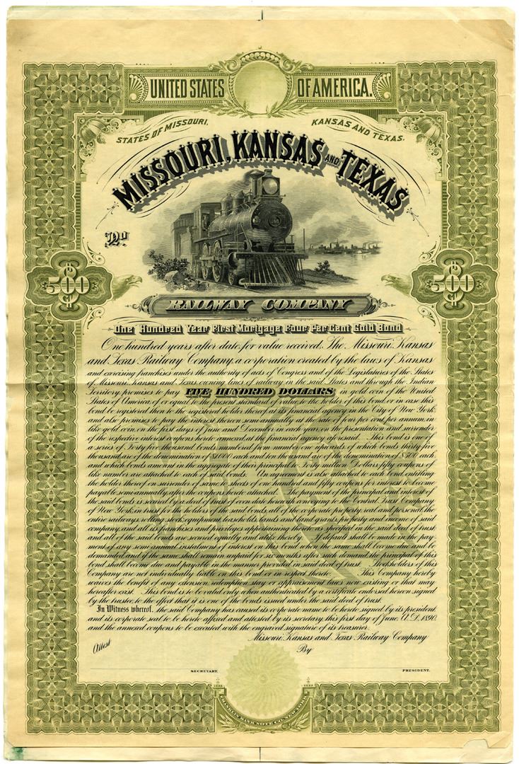 MO, KS, TX, 1890. $500 Proof 4% First Mortgage Gold Coupon Bond, Black text with olive border and undertint, Train passing on tracks at top center. Wide margins, especially on separate coupon pages. VF condition, FBN. Rare proof in Cox.