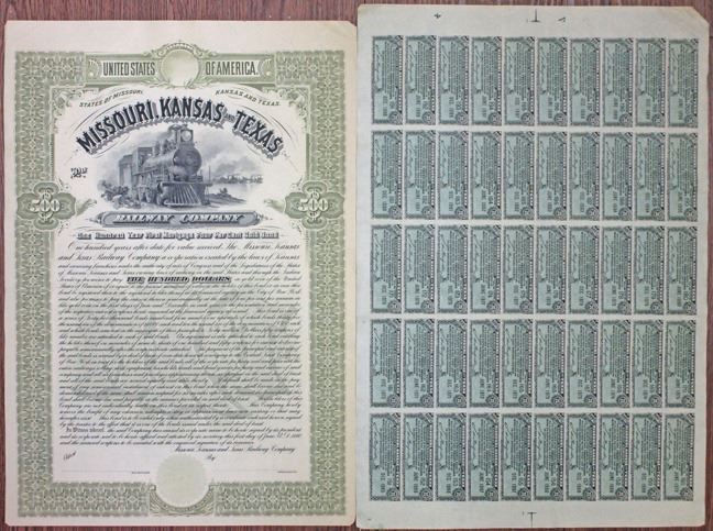 MO, KS & TX, 1890. $500 Specimen-Proof 4% First Mortgage Gold Coupon Bond, Black text with olive border and undertint, Train approaching by river with factories in distance at top center. VF condition, FBN. Unlisted in Proof format in Cox, Very Rare.