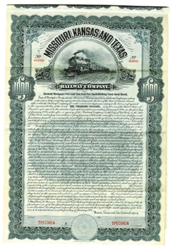 Kansas. $1000 Specimen 4 1/2% General Mortgage Sinking Fund Gold Coupon Bond, Black print on blue/gray border and under tint, Locomotive coming head-on at top, Specimen overprints and POC's, Fine-VF condition with minor toning, ABNC.