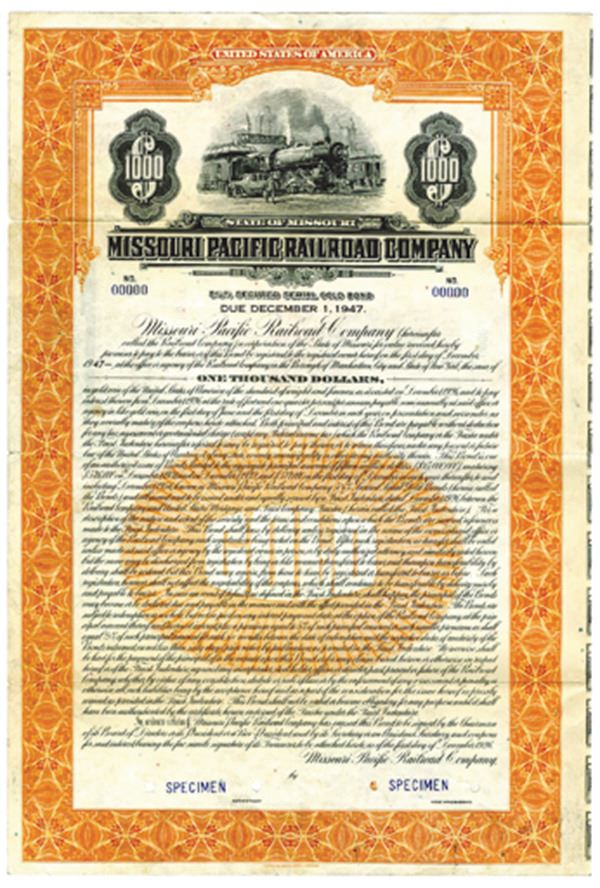 Missouri. $1000 Specimen 5 1/4% Secured Serial Gold Coupon Bond, Black print on orange border and under tint, Locomotive outside station at top, Specimen overprints and POC's, Fine condition with splitting along fold lines condition, ABNC.
