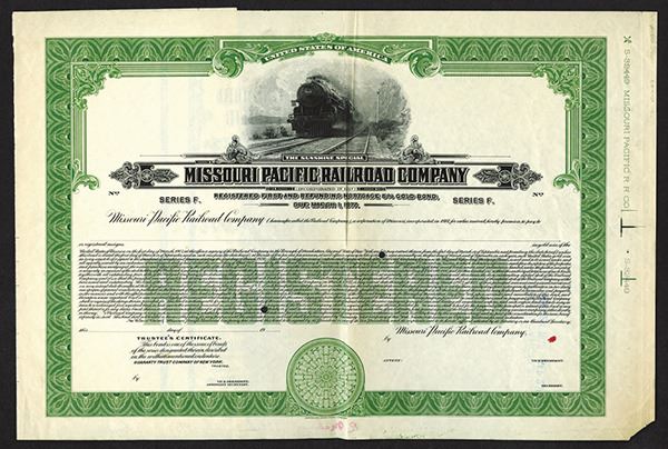 MO. $-Odd Registered Bond. Two color plate proof reference copy for plate cancelation in 1956. Nice vignette of the Sunshine Special at top center. Fine with stampings. ABNC, Possibly unique.