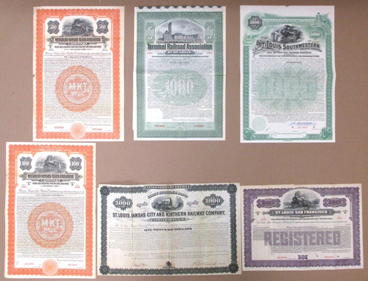 Texas, Missouri, Illinois, 1879 to 1928. Lot of 6 Bonds, Includes: 1879, St. Louis, Kansas City and Northern Railway Co. $1000 I/U 6% Gold Coupon Bond; 1891, St. Louis Southwestern Railway Co. $1000 Specimen 4% Gold Coupon Bond; 1916, St. Louis-San Francisco Railway Co. $1000 Specimen Registered 4% Gold Bond; 1903, Terminal Railroad Association of St. Louis, $1000 Specimen 4% Gold Coupon Bond; and 1922 Missouri-Kansas-Texas Railroad Co. $100 Specimen 5% Gold Coupon Bond; and, $500 Specimen 4 1/2% Coupon Bond. Specimens have Specimen overprints and POCs, All bonds range from VF with splitting to XF condition. (6). Sold "AS IS" no returns accepted.