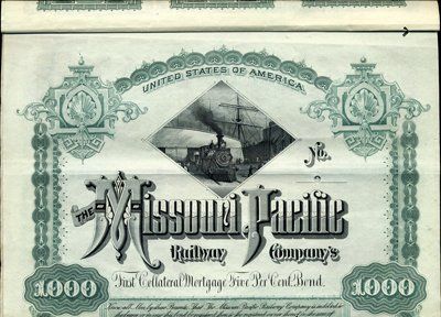 1890. $1,000. Specimen 1st Collateral Mortgage 5% bond. Green border. Locomotive at dock on top and worker on locomotive on bottom. XF condition. POC's. Coupons attached. Rare certificate. NYBNC.