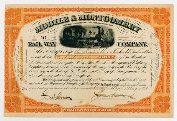 Alabama. 100 Shares Capital Stock I/C Stock Certificate, Black print on orange border and under tint, Locomotive leaving tunnel at top, VF-XF condition with cut close margins, NBNC.