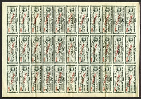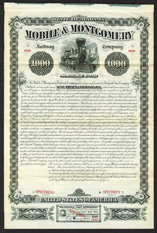 Alabama, 1881, $1000, Specimen Mortgage 6% Bond. Black border. Train at station with a single coupon on bottom. XF condition. Coupons attached. Red specimen overprints, POC's and "00000" serial numbers. Rare and attractive bond. Unlisted railroad in Cox. ABNC.