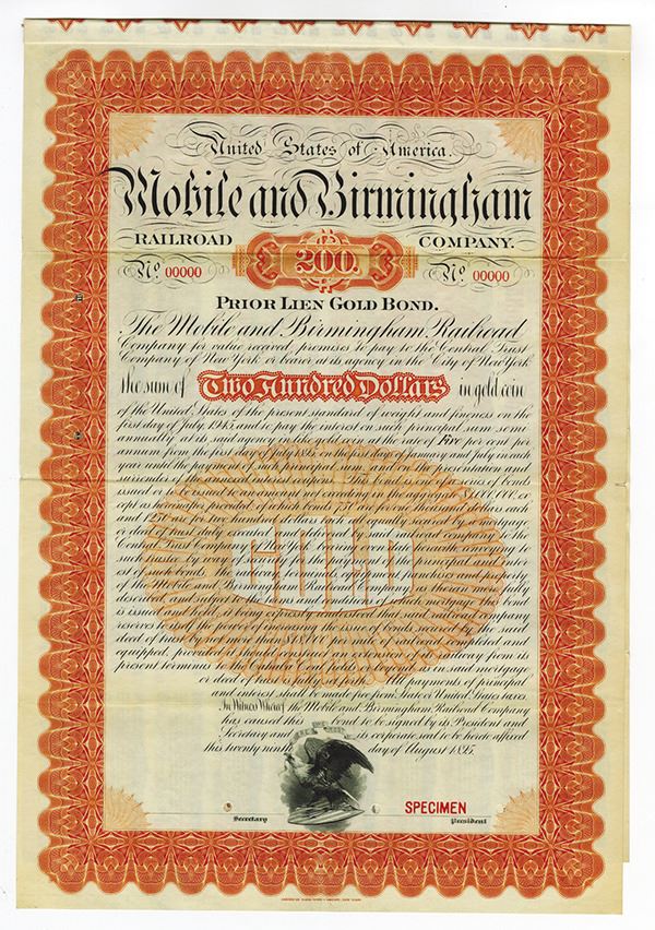 Alabama. $200 Specimen Prior Lean Gold Coupon Bond. Black print with a very ornate orange border and underprint. No vignette of certificate, only company title at top center. Specimen overprints, POC's, XF condition with all coupons attached. ABNC.