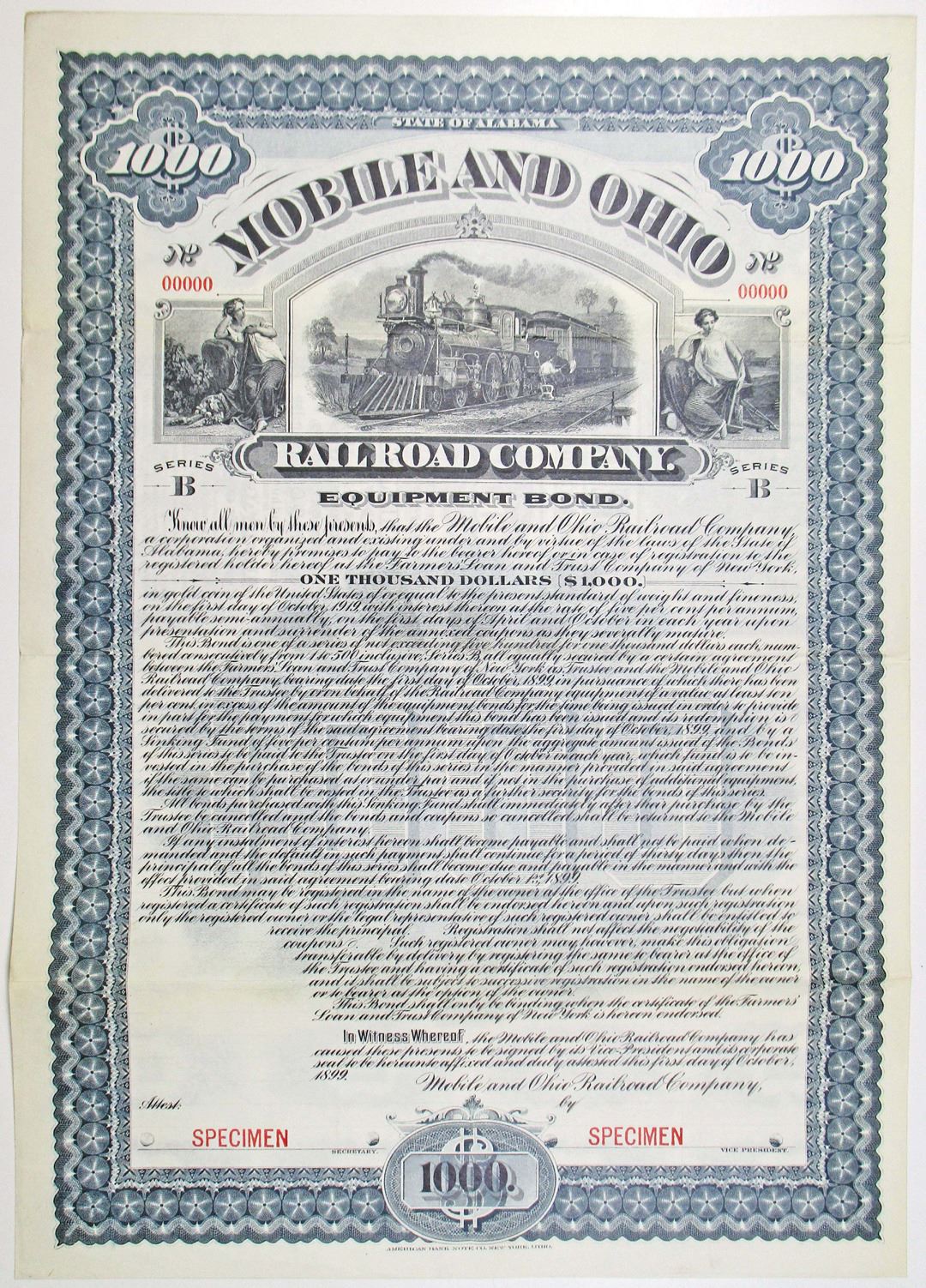 Alabama, 1899. $1000 Specimen 5% Equipment Coupon Bond, Black text with blue border and undertint, Train passing on tracks flanked by allegorical women at top center. Red specimen overprints, 00000 serial numbers, and POCs. VF condition, ABNC. Unlisted design and specimen in Cox. Only 2 examples found in the ABN Archives in 2002.