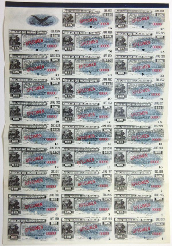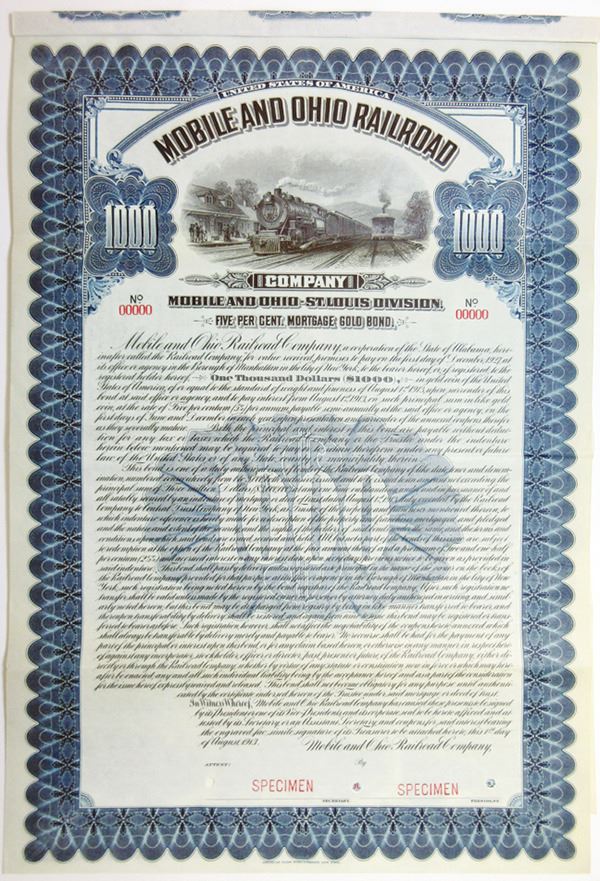 Ohio. $1,000 Specimen 5% Mortgage Gold Coupon Bond St. Louis Division, Locomotive approaching station while another train departs, specimen overprints and POC's, VF-XF condition, ABNC. Unlisted on Cox.