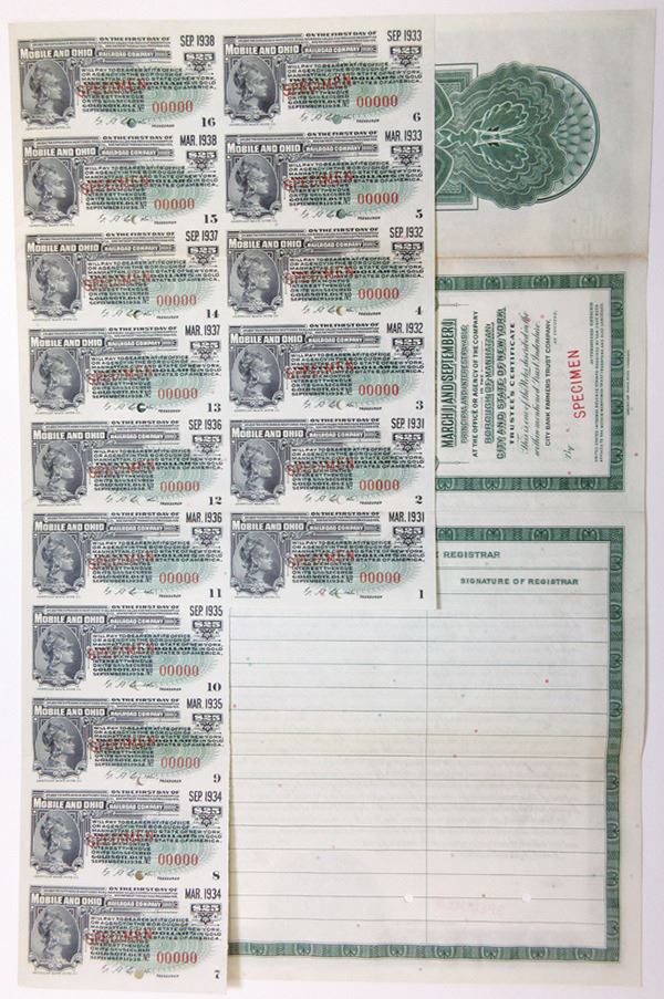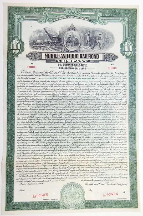 Alabama. $1,000 Specimen 5% Secured Gold Coupon Bond, Black print on green border and under tint, Locomotive in oval at top center flanked on either side by logging operation and mining operation, Specimen overprints and POC's, VF-XF condition, ABNC. Unlisted Bond variety on Cox.