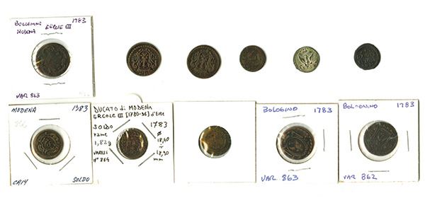 Italy, lot includes 2 Bolognini, 1784, C-16, 2 pcs one UNC one VF; 2 Bolognini, 1783, C-16, Fine; 1 Bolognini, 1783, 5 pcs Fine to Very Fine; 1 Soldo, 1783, 3 pcs Fine to Very Fine; and 1 Soldo, 1784, Fine.