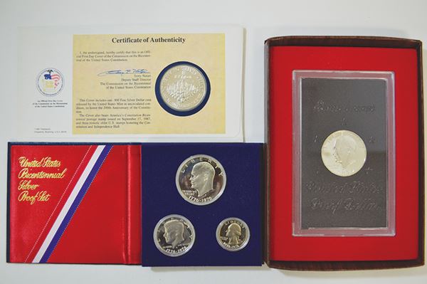 U.S. Selection of Modern Commemoratives. Eisenhower Silver Dollar Unc. 1971S (2), 1972S, 1973S, Proof 1972S. 3 pieces Bicentennial Unc and Proof sets; Proof Half Dollars: 1982S Washington (2, one box without cover); 1986S Statue of Liberty; Proof Silver Dollars: 1984S Olympics Stadium Statue (fingerprints); 1988S Olympics Torch (3, two coins foggy, one box sleeve stained; 1986 Statue of Liberty Silver Dollar singles (3, one foggy); Statue of Liberty Half and Dollar; 1987 Constitution Dollar. Uncirculated in Fleetwood FDC. 24 pieces.