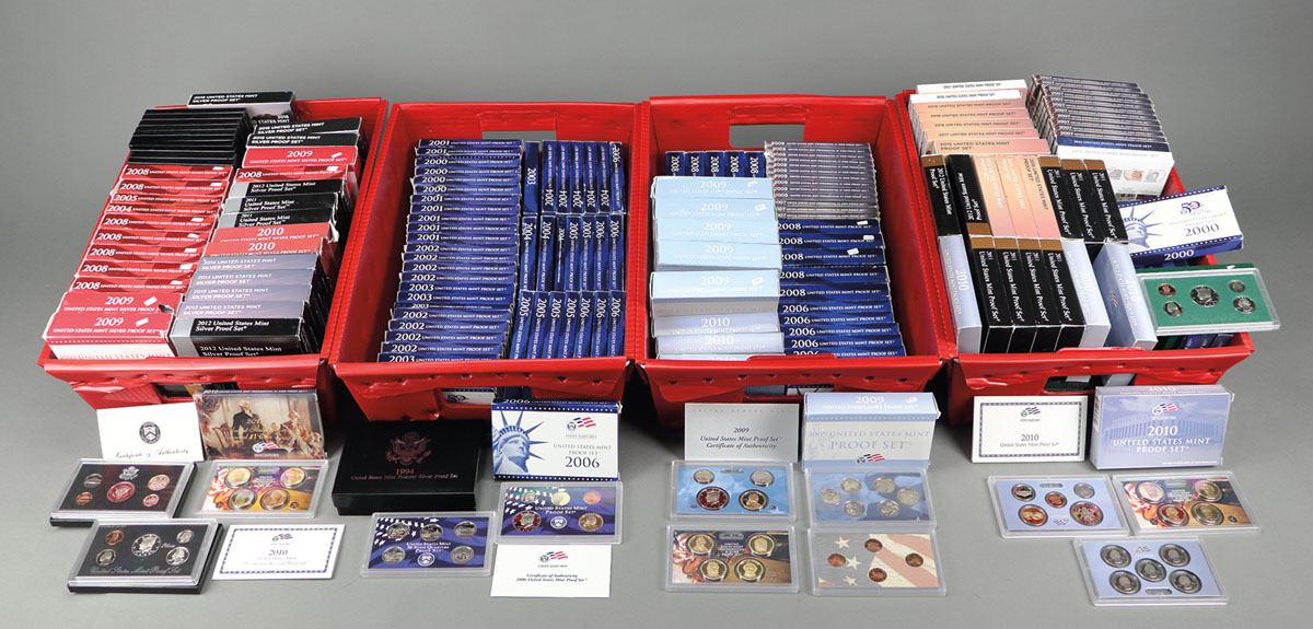 massive holding of over 320 proof sets; includes Silver proof sets 2004-2022 in various quantities including the key dates of 2012, 2019 and 2020; ten Prestige and Premier proof sets from 1986-98; Presidential proof sets included from 2007-2016; States Quarters proof sets from 2006-2009; clad proof sets from 1999-2022 and many others; inventory available online. Shipping charges apply - weight 119 lbs. (photo on web site)