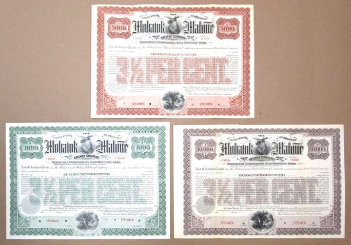 New York, ND (1902). Lot of 3 Specimen, all are 3.5% Registered Consolidated Gold Mortgage Bonds in different colors and denominations: $1000 in Green, $5000 in brown, and $10,000 in Purple. All have Vignette of Buck at top center and herd of deer at bottom, Specimen overprints and POCs, are all in VF to XF condition, ABNC. (3). Sold "AS IS" no returns accepted.