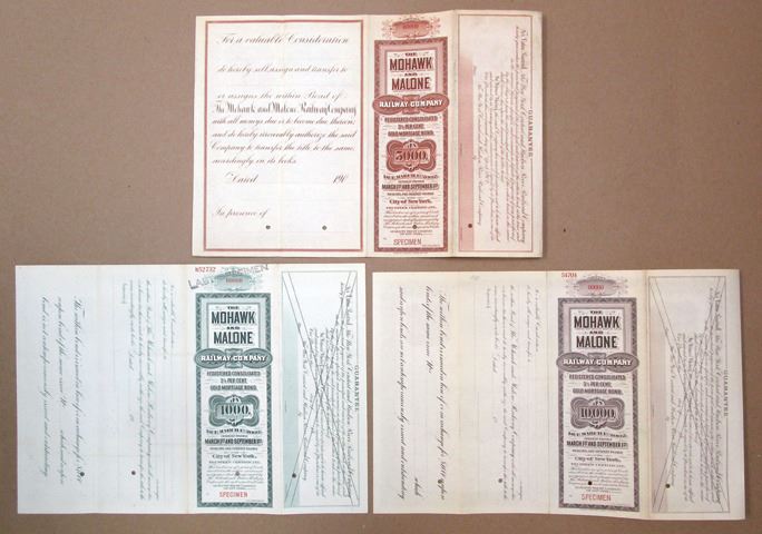 New York, ND (1902). Lot of 3 Specimen, all are 3.5% Registered Consolidated Gold Mortgage Bonds in different colors and denominations: $1000 in Green, $5000 in brown, and $10,000 in Purple. All have Vignette of Buck at top center and herd of deer at bottom, Specimen overprints and POCs, are all in VF to XF condition, ABNC. (3). Sold "AS IS" no returns accepted.