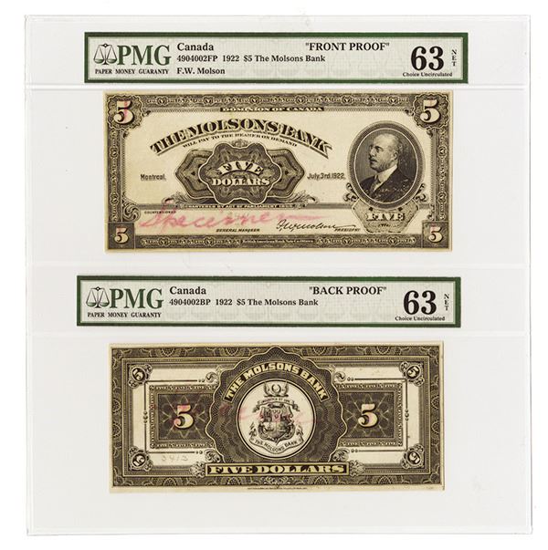 Montreal, Canada. $5 July 3, 1922 Ch. # 490-40-02S, Both the face and back have the word "Specimen" written on them in red ink. PMG graded Choice Uncirculated 63 NET. The reverse of both specimens have minor traces of adhesive.