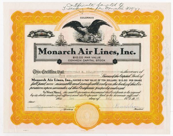 Colorado. 500 Shares Capital Stock I/U Certificate, Black print on large orange border and under tint, Company title at top with bald eagle on top, VF-XF condition, Bradford-Robinson. Monarch Airlines was an American airline based in Denver, Colorado, that began its scheduled air service on November 27, 1946, with a flight from Denver to Durango, Colorado, using a Douglas DC-3. It was formed by F.W. Bonfils of The Denver Post family and Ray M. Wilson, who operated a Denver flying school. Other services started to Albuquerque, Salt Lake City and Grand Junction. Monarch pioneered all-weather operations in its service area by installing its own navigational system. By 1948, the airline was sharing several functions with Challenger Airlines, such as maintenance and sales at Denver. Monarch bought a controlling interest in Challenger in December 1949. Monarch merged with Arizona Airways and Challenger Airlines on June 1, 1950, to form Frontier Airlines. Monarch's President, Hal S. Darr, became President of the new airline. Ray Wilson became V.P. Operations and Maintenance of the new company and Monarch's Treasurer, C.A. Myhre, became Executive Vice President and later President of Frontier.