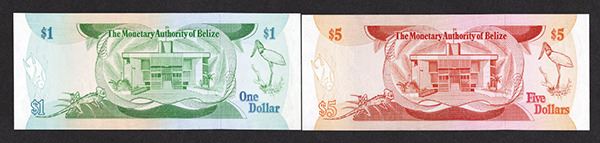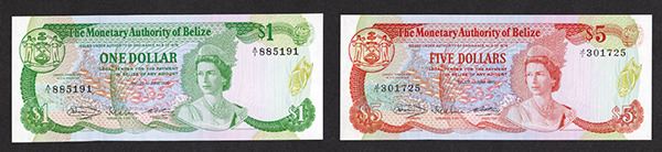 Belize. 1, 5 Dollar. P-38a, 39a. Elizabeth II at right end. Both Choice to Gem Uncirculated. 2 pieces.