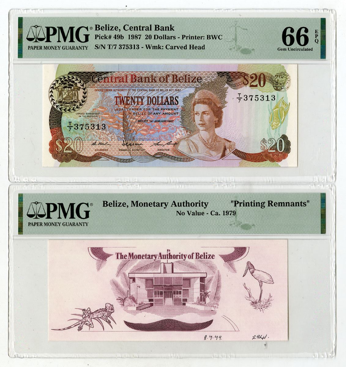 Belize, 1979-87. Lot of 2, Includes: Monetary Authority of Belize Printing Remnant without denomination; Central Bank of Belize 20 Dollars, P-49b, S/N T/7 375313, PMG graded Gem Unc 66 EPQ. (2). Sold "AS IS" no returns accepted.