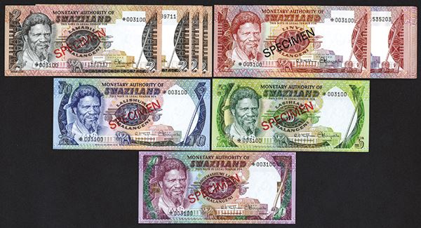Swaziland, includes P-CS1 specimen set of 1 Lilangeni, 2, 5, 10, and 20 Emalangeni, specimen set number *003100; also included 1 Lilangeni, P-1, UNC (12 pcs); and 2 Emalangeni, P-2a (2 pcs) and P-8b. All UNC. TDLR.