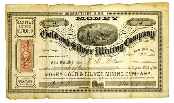 Cooke Ledge, Palmyra Mining District, N.T., November 13th, 1863. 15 Shares, I/U, Man looking at mining mill in background, S/N 5, Issued in Santa Rosa, California. Part Perf 25 cents adhesive U.S.I.R. stamp at left, Rough edges and toning but still very rare. Sonoma Democrat Print.