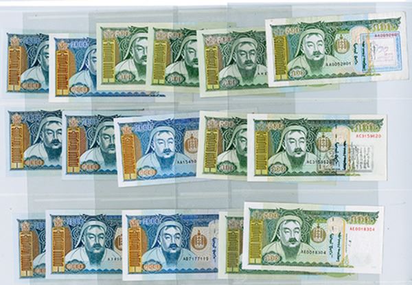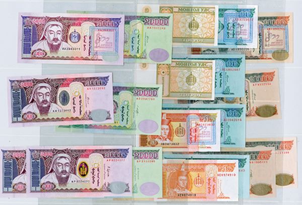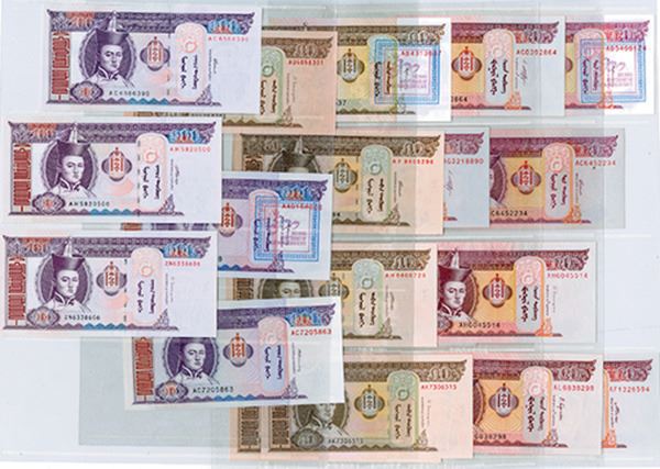 Mongolia. Complete collection of modern issues starting 1993. Includes all denominations from 1 Tugrik to 20000 Tugriks, with all signature and date combinations to date. Included are 1 Tugrik (1993, 2008, 2013); 2 Tugrik (1993, 2008, 2014); 10 Tugrik (1993, 2002, 2005, 2007, 2009, 2011, 2013, 2014, 2017, 2018); 20 Tugrik (1993, 2002, 2005, 2007, 2009, 2011, 2013, 2014, 2017, 2018); 50 Tugrik (1993, 2000, 2008, 2013 two pieces including ZZ replacement, 2016); 100 Tugrik (1993, 1994, 2000, 2008, 2014); 500 Tugrik (1993, 1997, 2000, 2003, 2007, 2011, 2013, 2016); 1000 Tugrik (1993, 1997, 1998, 2003, 2007, 2011, 2013, 2017); 5000 Tugrik (1994, 2003, 2013, 2018); 10000 Tugrik (1995, 2002, 2009, 2014); and 20000 Tugrik (2006, 2009, 2013). Also included are the fractional 10 Mongo, 20 Mongo, and 50 Mongo notes of 1993 (P-49 to P-51). Generally About to Choice Uncirculated, with a couple of Choice VF-XF notes. The 1993 dated notes have a special "800th Anniversary of Great Mongolian State" handstamp. Tough to assemble and a nice opportunity for a collector looking to get into this area. 65+ pieces.
