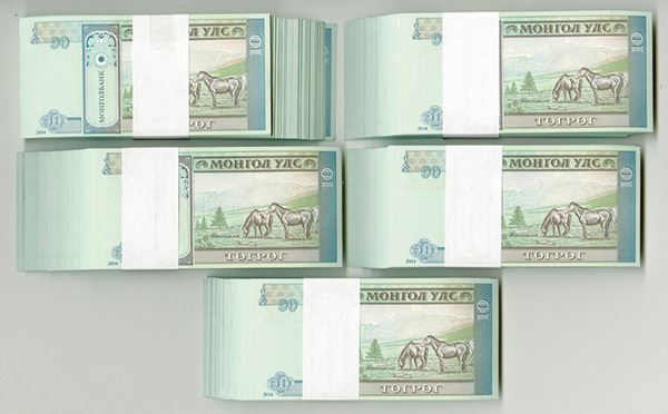 Mongolia. Issued 10 Tugrik, 2014, P-62h, five packs each containing 100 sequential notes, generally choice to gem UNC with a couple AU.