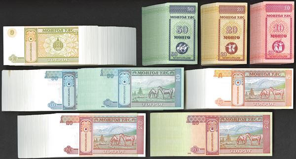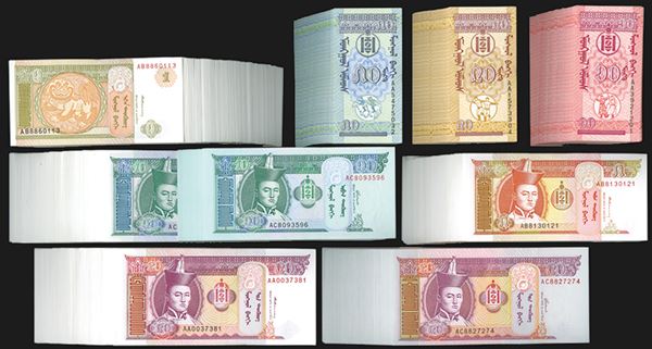 Mongolia. 10, 20, 50 Mongo. P-49, 50, 51; 1, 5, 10, 20 Tugrik P-52, 53, 54, 55 (more than 50 of each); 2002 Issue of 10, 20 Tugrik P-62, 63 (more than 40 of each). All Crisp Uncirculated or nearly so. Sold as is. NO RETURNS.