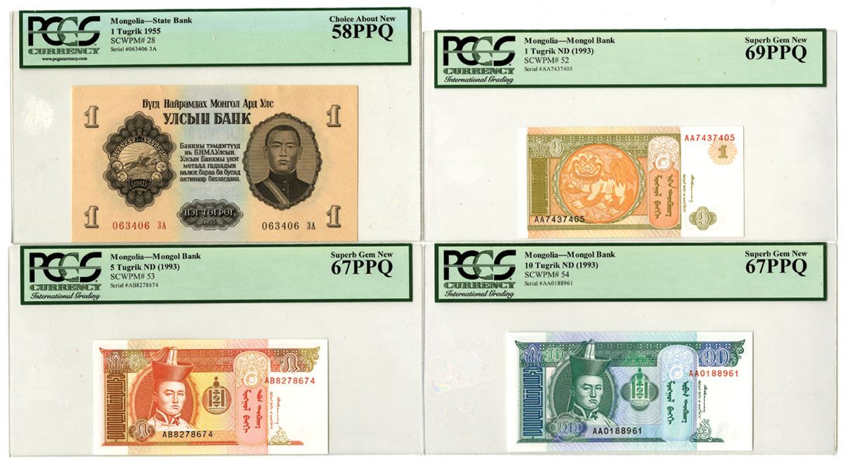 Mongolia, 1955-ND (1993). Lot of 4 Issued Banknotes, Includes: 1955, State Bank of Mongolia 1 Tugrik, P-28, PCGS Choice About New 58PPQ; ND (1993) Mongol Bank 1 Tugrik, P-52, PCGS graded Superb Gem New 69PPQ; 5 Tugrik, P-53, PCGS graded Superb Gem New 67PPQ; 10 Tugrik, P-54, PCGS graded Superb Gem New 67PPQ. (4). Sold "AS IS" no returns accepted.