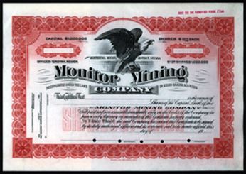 Tonopah, Nevada. 19xx (ca. 1900-1920), Shares, Eagle over title, Red, SBN, POC's, XF. Montezuma Mining District, Nevada. Extremely rare as a specimen.