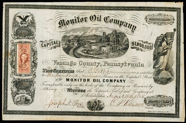 Venango County, Pennsylvania, 1865, 100 Shares, #412, I/U stock certificate, Black with no underprint, Oil wells, barrels, railroad and harbor scene in middle, Patriotic standing Liberty on globe with flag on right and ornate counterfoil with eagle and U.S. Revenue stamp on left, VF condition. Scarce Pennsylvania oil company.
