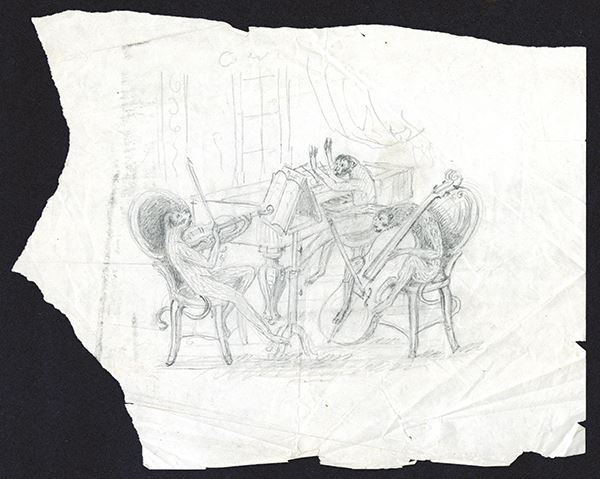 Humorous study of three monkeys playing violin, piano and bass. 9x7 irregular sheet of paper.