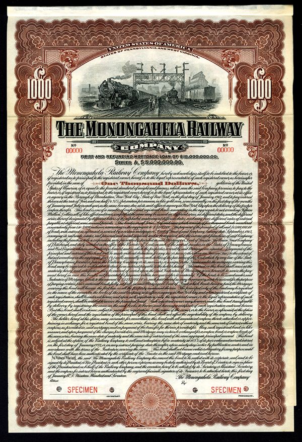 Monongahela Railway Co., 1917 Specimen Bond. PA. WV. 1917, $1000 Specimen 4 1/2% 1st and Refunding Mortgage Loan Gold Coupon Bond, Black on brown border and undertint. ABNC. Only known as Specimen in Cox.
