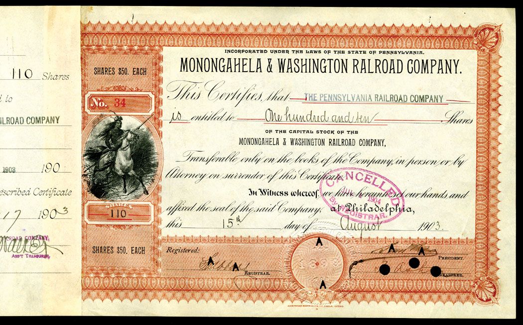 Philadelphia, Pennsylvania, 1903, Monongahela & Washington Railroad Co. 110 Shares, $50 each, Stock Certificate. ABNC.